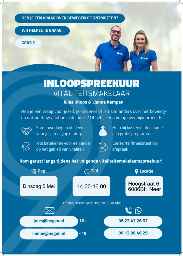 Onder het genot van een kopje koffie of thee helpen we je graag bij vragen rondom vitaliteit, bewegen en meedoen. Je hoeft geen afspraak te maken om langs te komen bij het spreekuur.