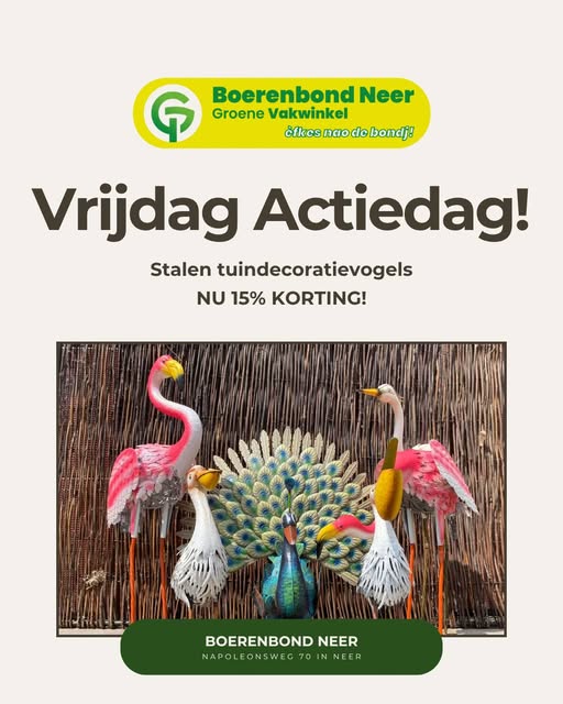 De stalen tuindecoratievogels zijn een hele maand met 15% korting verkrijgbaar.