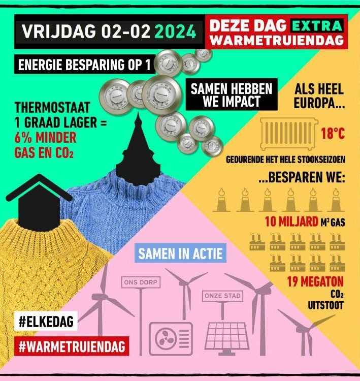 Deze vrijdag is het warmetruiendag! Wist je dat je wel 6% gas en CO2 kunt besparen door de thermostaat al 1 graad lager te zetten? Doe dus mee en meld je aan op warmetruiendag.nl