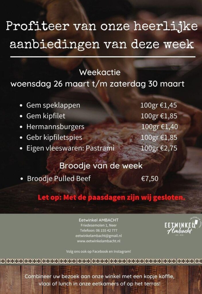 Profiteer van onze heerlijke aanbiedingen van deze week Weekactie woensdag 26 maart t/m zaterdag 30 maart • Gem speklappen 100gr €1,45 • Gem kipfilet 100gr €1,85 • Hermannsburgers 100gr €1,40 • Gebr kipfiletspies 100gr €1,85 • Eigen vleeswaren: Pastrami 100gr €2,75 Broodje van de week • Broodje Pulled Beef €7,50 Let op: Met de paasdagen […]