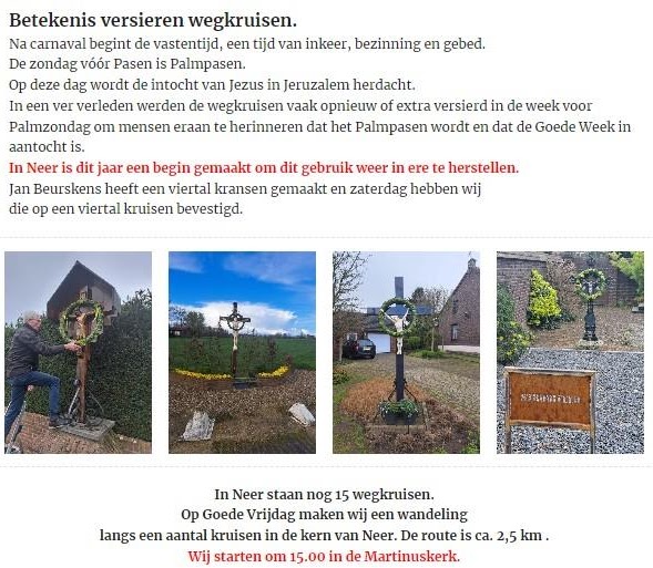 Na carnaval begint de vastentijd, een tijd van inkeer, bezinning en gebed. De zondag vóór Pasen is Palmpasen. Op deze dag wordt de intocht van Jezus in Jeruzalem herdacht. In een ver verleden werden de wegkruisen vaak opnieuw of extra versierd in de week voor Palmzondag om mensen eraan te herinneren dat het Palmpasen wordt […]