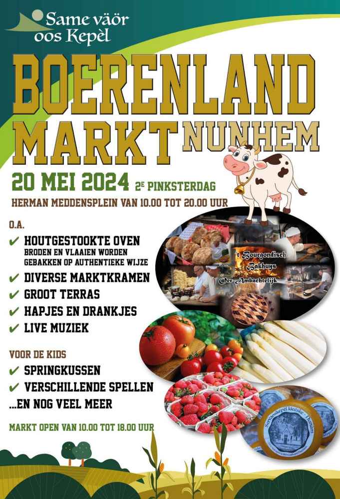 BOERENLAND MARKT NUNHEM 20 MEI 2024 25 PINKSTERDAG HERMAN MEDDENSPLEIN VAN 10.00 TOT 20.00 UUR Ο.Α. ✔ HOUTGESTOOKTE OVEN BRODEN EN VLAAIEN WORDEN GEBAKKEN OP AUTHENTIEKE WIJZE ✔DIVERSE MARKTKRAMEN GROOT TERRAS HAPJES EN DRANKJES ✔ LIVE MUZIEK VOOR DE KIDS ✓ SPRINGKUSSEN ✔ VERSCHILLENDE SPELLEN …EN NOG VEEL MEER MARKT OPEN VAN 10.00 TOT 18.00 […]