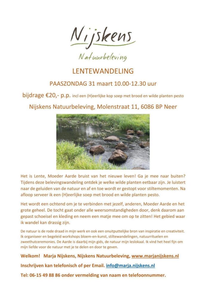 Nijskens Natuurbeleving LENTEWANDELING PAASZONDAG 31 maart 10.00-12.30 uur bijdrage €20,- p.p. incl een (H)eerlijke kop soep met brood en wilde planten pesto Nijskens Natuurbeleving, Molenstraat 11, 6086 BP Neer Het is Lente, Moeder Aarde bruist van het nieuwe leven! Ga je mee naar buiten? Tijdens deze belevingswandeling ontdek je welke wilde planten eetbaar zijn. […]