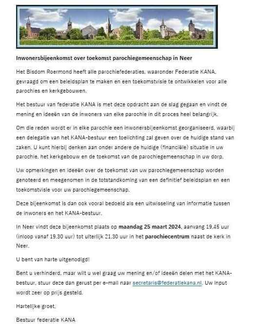Inwonersbijeenkomst over toekomst parochiegemeenschap in Neer Het Bisdom Roermond heeft alle parochiefederaties, waaronder Federatie KANA. gevraagd om een beleidsplan te maken en een toekomstvisie te ontwikkelen voor alle parochies en kerkgebouwen. Het bestuur van federatie KANA is met deze opdracht aan de slag gegaan en vindt de mening en ideeën van de inwoners van elke […]
