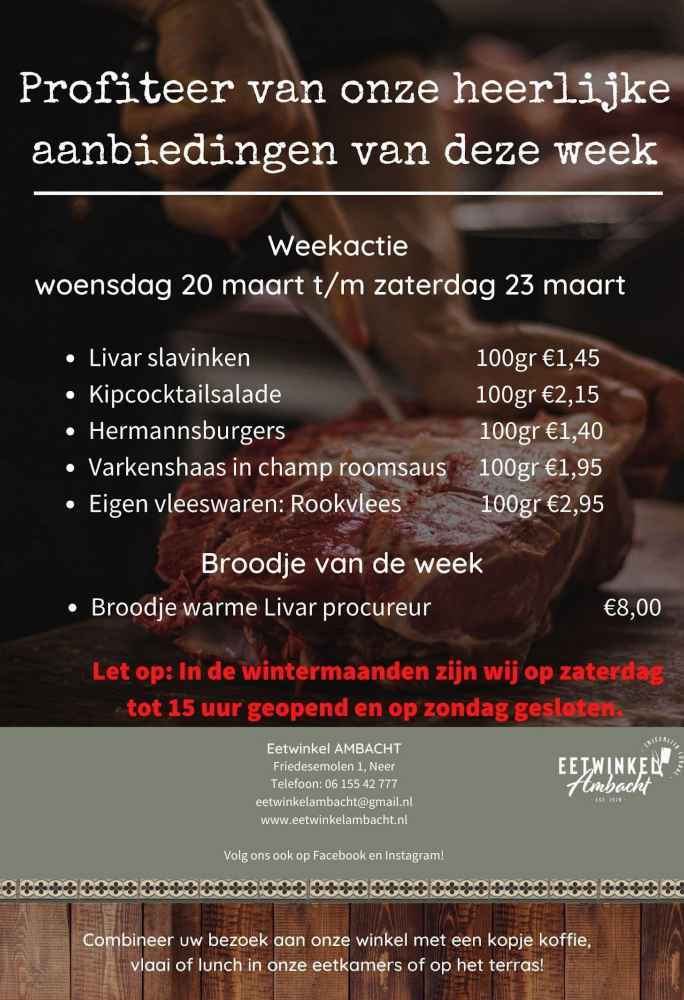 Profiteer van onze heerlijke aanbiedingen van deze week Weekactie woensdag 20 maart t/m zaterdag 23 maart • Livar slavinken 100gr €1,45 • Kipcocktailsalade 100gr €2,15 • Hermannsburgers 100gr €1,40 • Varkenshaas in champ roomsaus 100gr €1,95 • Eigen vleeswaren: Rookvlees 100gr €2,95 Broodje van de week • Broodje warme Livar procureur €8,00 Let op: In […]