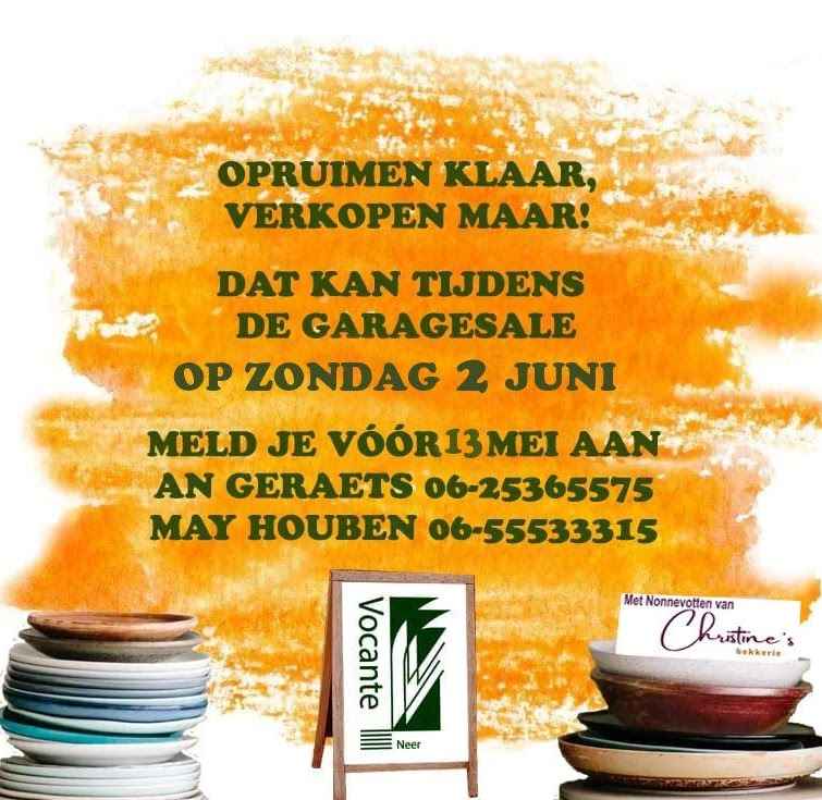 OPRUIMEN KLAAR, VERKOPEN MAAR! DAT KAN TIJDENS DE GARAGESALE OP ZONDAG 2 JUNI MELD JE VÓÓR13MEI AAN AN GERAETS 06-25365575 MAY HOUBEN 06-55533315