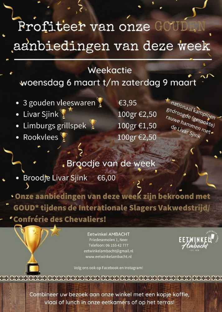 Profiteer van onze GOUDEN aanbiedingen van deze week Weekactie woensdag 6 maart t/m zaterdag 9 maart • 3 gouden vleeswaren €3,95 • Livar Sjink 100gr €2,50 • Limburgs grillspek 100gr €1,50 • Rookvlees 100gr €2,50 Broodje van de week • Broodje Livar Sjink €6,00 Onze aanbiedingen van deze week zijn bekroond met GOUD* tijdens de […]