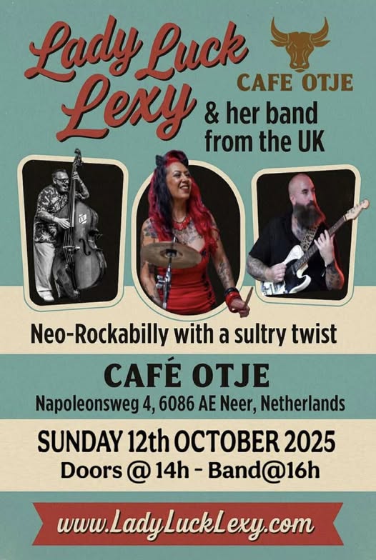 Lady Luck Lexy & her band from the UK bij Café Otje! Op zondag 12 oktober 2025 halen we een flinke dosis Neo-Rockabilly met een sultry twist in huis. Verwacht swingende contrabas, rock-’n-roll energie en een krachtige stem die je gegarandeerd niet stil laat staan. Café Otje – Napoleonsweg 4, Neer Deuren open: 14:00 uur […]