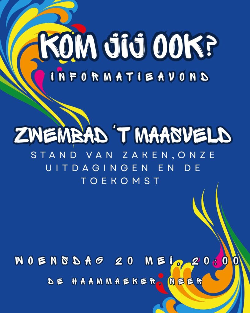 Op woensdag 20 mei hebben wij een informatieavond over het zwembad in de Haammaeker in Neer. We gaan het onder andere hebben over hoe wij ervoor staan, onze banden met ’t Maasveld en wat onze toekomst inhoudt. We nemen iedereen hier graag in mee; zo weten jullie ook waar jullie aan toe zijn.