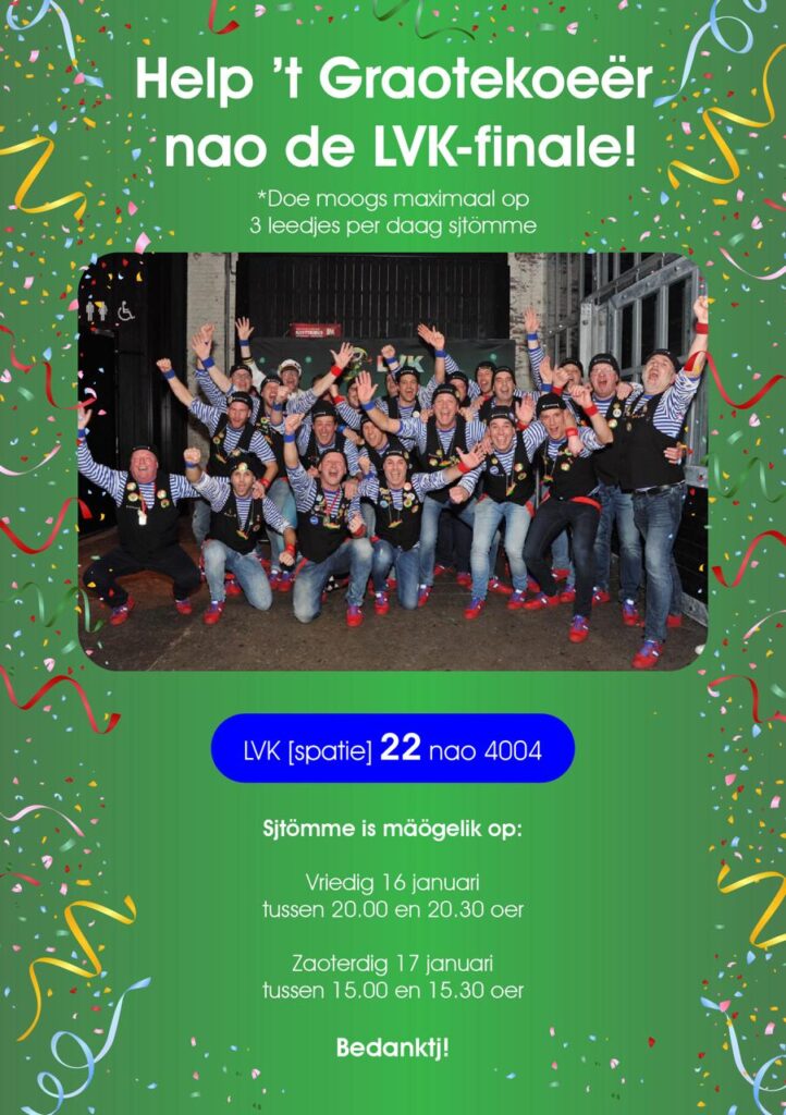 Väörig jaor zeen wae rech in oos hert geraakt door alle stömme die wae mocht ontvange! Helpt gae Raoj ‘ns dit jaor weer 𝘀𝗷𝗼𝘂𝘄𝗲𝗿 𝗮𝗮𝗻 𝘀𝗷𝗼𝘂𝘄𝗲𝗿 nao de LVK-finale?